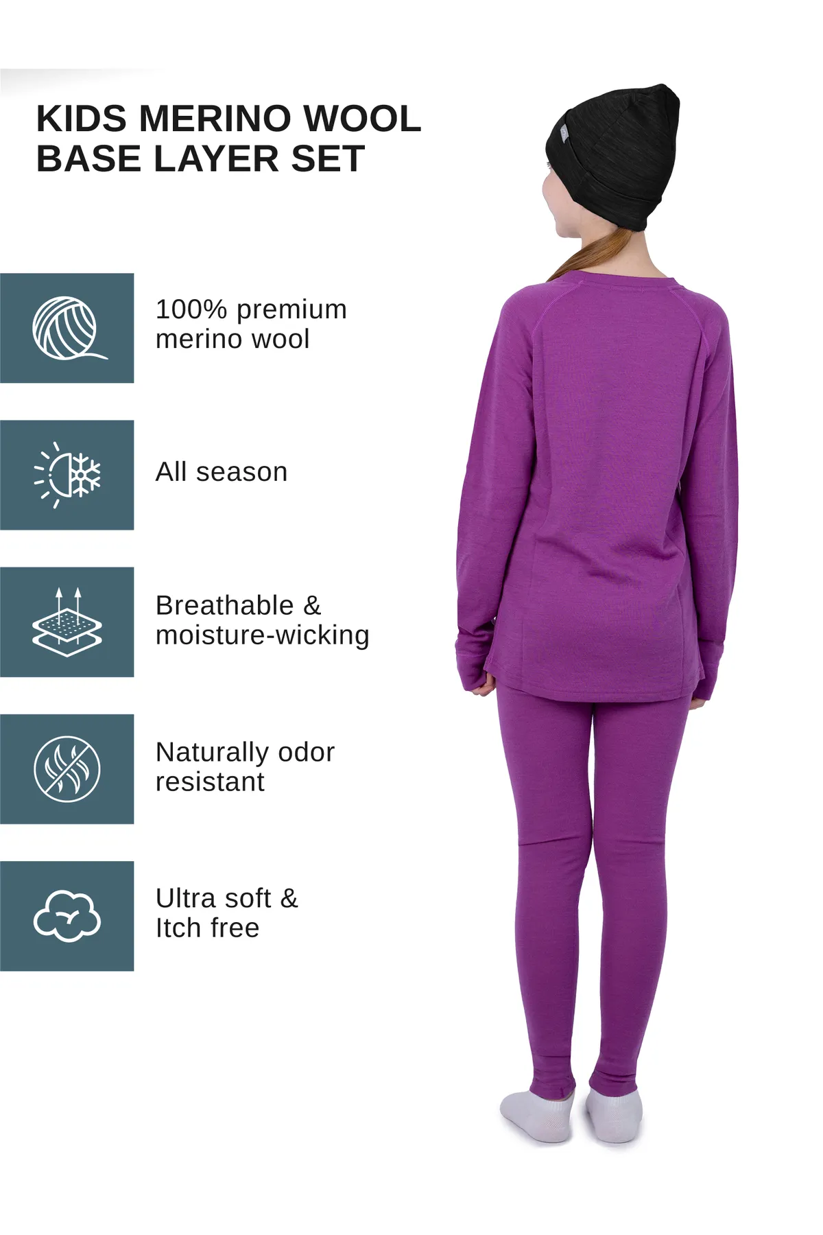 Soft, stylish, and smart — the Violet Purple Kids’ Merino Set is made for adventure and comfort. Crafted from fine Merino wool, it offers exceptional thermoregulation, keeping your child warm in the cold and cool when it’s warm. The fabric’s breathability and moisture control prevent clamminess, while natural odor resistance keeps it fresh longer.